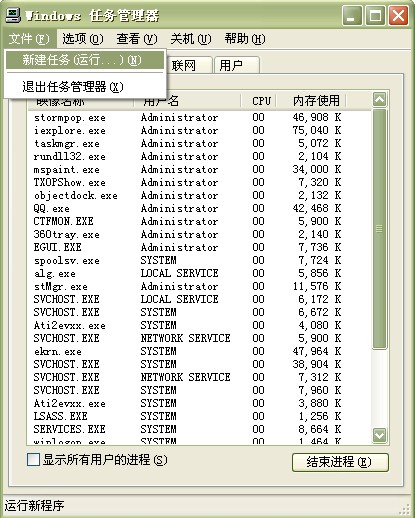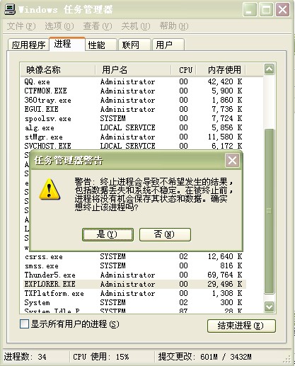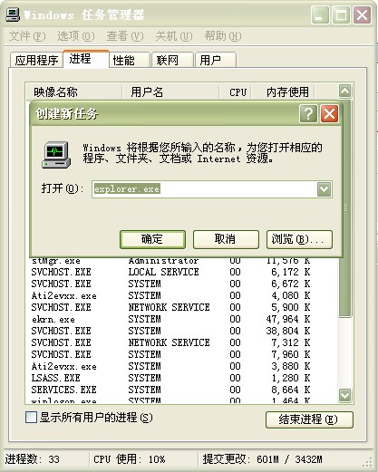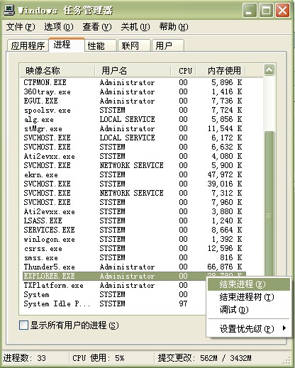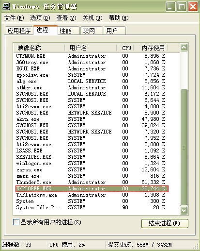 其实这都是一个叫做explorer.exe的进程惹的祸。我们只要用组合键(ctrl+alt+delete)调出任务管理器,在系统进程表里面,可以看到它: