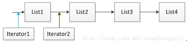 这里假设集合List由四个元素List1、List2、List3和List4组成,当使用语句Iterator it = List.Iterator()时,迭代器it指向的位置是上图中Iterator1指向的位置,当执行语句it.next()之后,迭代器指向的位置后移到上图Iterator2所指向的位置。