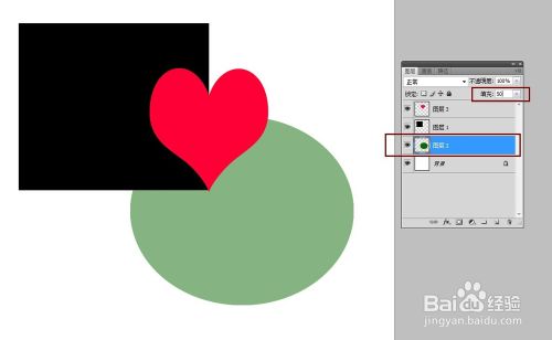 8、如何移动图层呢?我举例说明第一张图片是心形在最上面,而第二张图片心形下降了一层,黑色方块来到了第一层,如何移动自己想要移动的图层呢?方法是:点击并拖住心形的图层,移动到黑色方块图层的下面,也可以点击并拖着黑色方块图层移到心形图层的上面。
