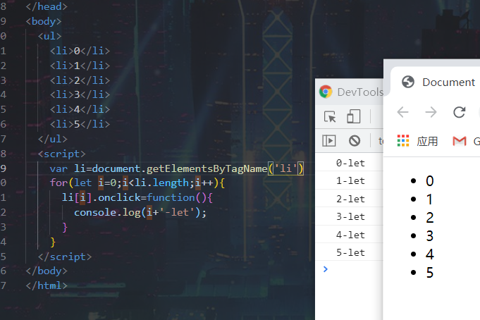 原因是我们触发点击事件的时候for循环已经执行完毕,此时j=6。因此无论我们点击那个li标签都只会打印出4,这时就已经形成了闭包。