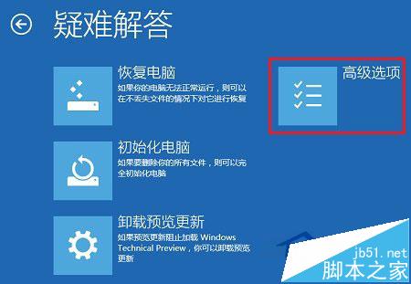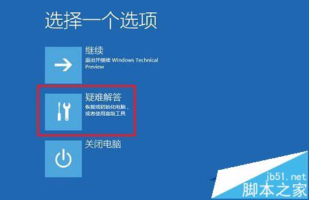 第四步、电脑重启后,在选择一个选项界面,点击疑难解答