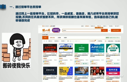 猪八戒网、猿急送、一品威客、码市等等,每个平台都有接单任务,需求不一样难易度不一样,所获得的报酬也有高有低,我一般做的比较多的是爬虫和数据分析这一块,主要是对我来说更容易做一点,虽然做一单的报酬也就几百块,但是完成的效率高,单子多又轻松,五个单子做完基本能赚两千多。建议初级的python 学者可以先追求量,等技术上来了再去做一些难度高报酬高的单子