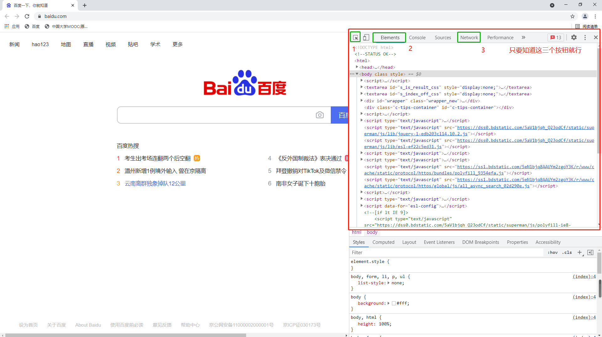 按住F12弹出来的内容,叫做开发者工具,是爬虫工程师的利器,我们只要会用下图这三个按钮就够了。