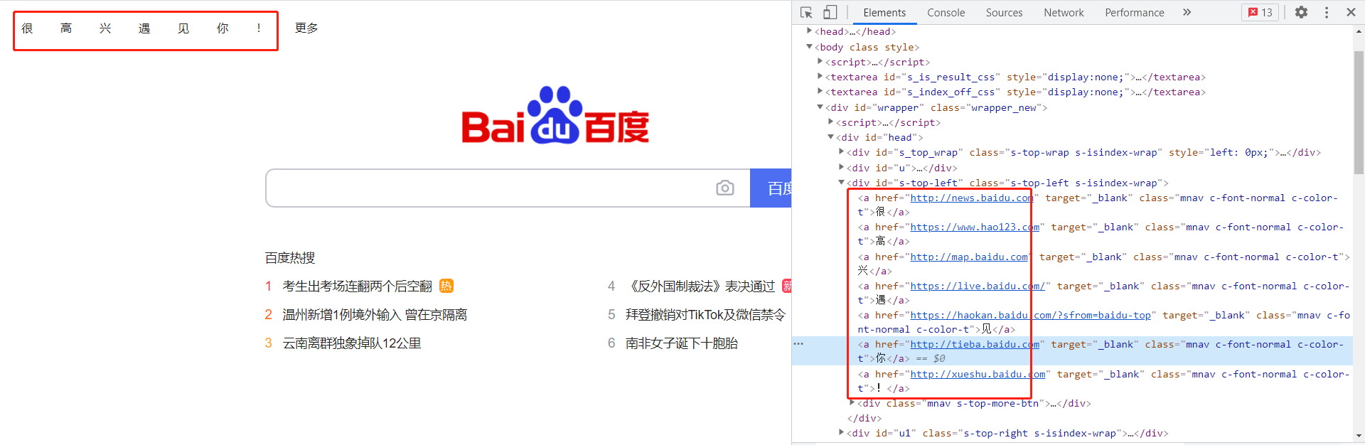 元素按钮里面的内容就是网站的源码,我们最后爬虫爬到的内容也是这个样子。在上图新闻那个地方鼠标双击俩下,这两个字变成可编辑的格式了!同理,我们可以改其它几个内容,如下图:改完之后,我们可以看到这个网页最上面一栏出现“很高兴遇见你!”一行字,这一行字就是我们刚刚在源码那里改的文字。