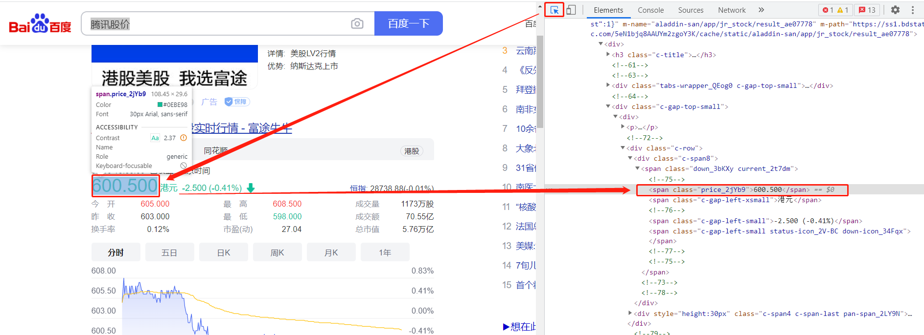 我们还可以用同样的操作,先选择选择按钮,点击下面的腾讯股价: