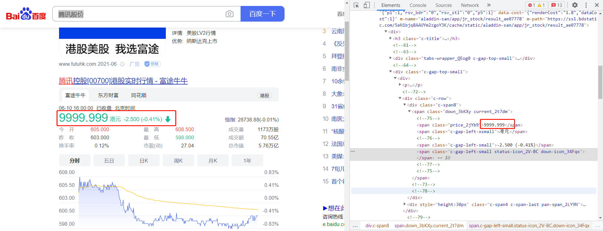 用同样的方法在Elements里对这个数字进行修改,可以改成任何你想改的数据,比如改成: