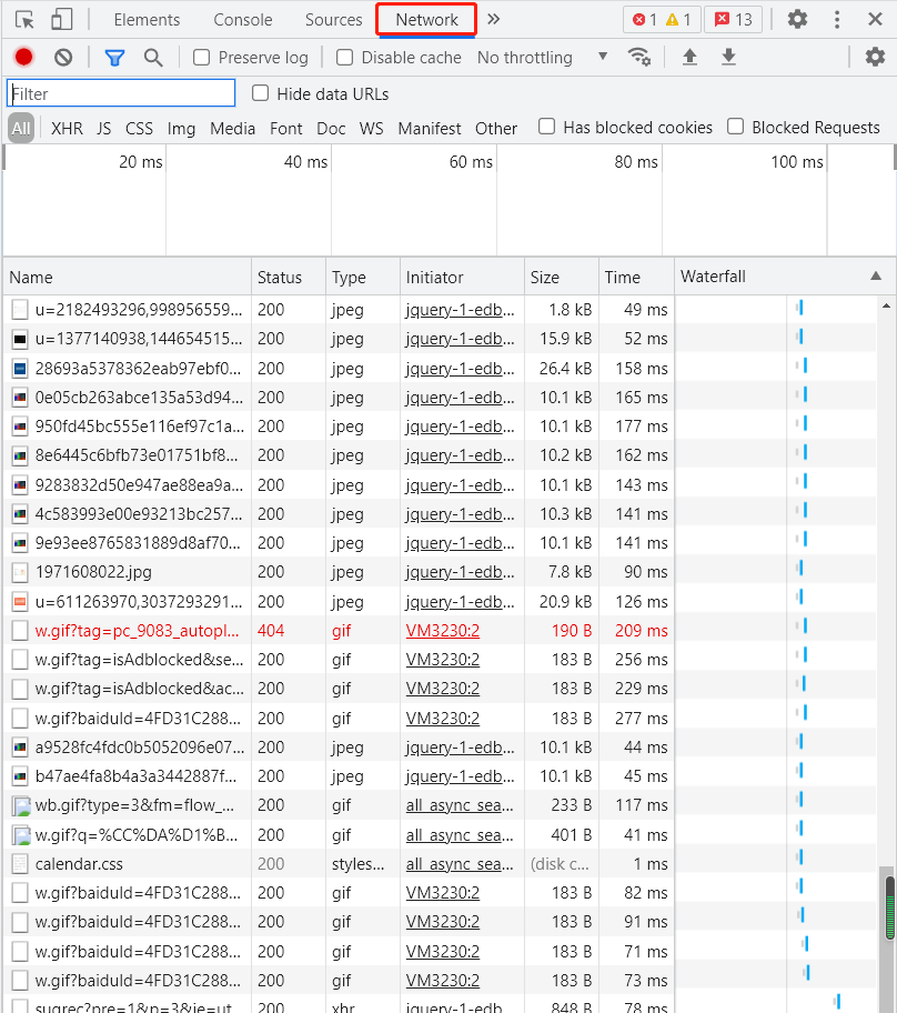 切换到Network选项卡,随后重新刷新页面,可以发现这里多了很多内容,这些内容其实都是我们看到的这个网址上的子网址。