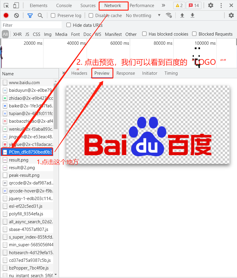 我们把滚轴拖到最上面,点击图中所示的地方,发现右边会弹出一些框,选择Prewiew,我们可以看到它就是baidu的logo。