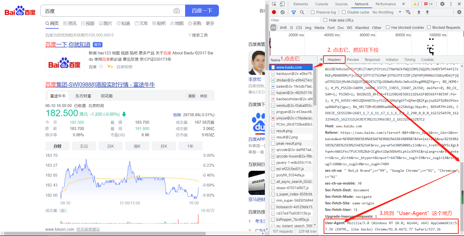 (这里是重中之重的重点!!!)我们把滚轴滚到最上面,然后选择第一个百度的网址,然后选择右边的Headers,然后一直往下拉,在Request Headers下面我们会看到有一行叫做User-Agent,它其实就是证明了你是在通过一个浏览器在访问这个网址,这是浏览器的一个代号,当你访问别的网站的时候这个User-Agent是不变的。