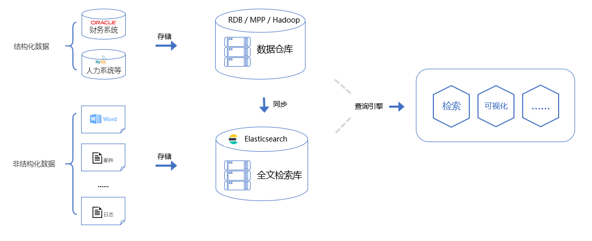 - 对非结构化数据的搜索:如用Google和百度等搜索引擎可以搜索大量内容数据。