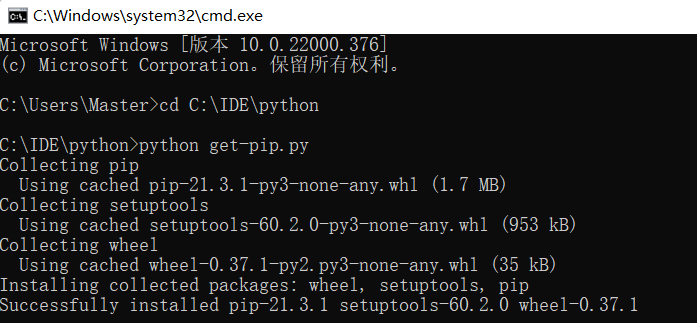 并移动至python根目录,cd命令打开python目录,输入python get-pip.py 再回车
