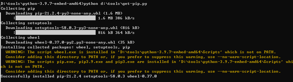 在cmd命令行环境下,将当前目录切换到python的根目录,第一次未切换到python根目录时执行是不成功的,所以虽然上面已经设置的环境变量,也还是要切换到python根目录然后执行:python xx/xxx/get-pip.py