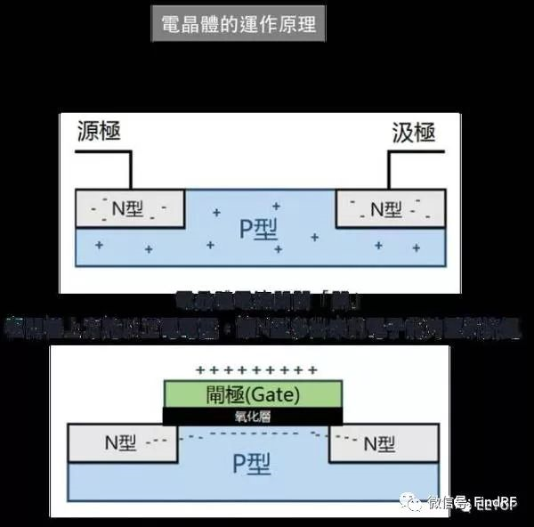 由于P型和N型分别多了电子和少了电子,所以电晶体在 N 型和 P 型接起来的状态下电子不会流通,此时电流开关为「关」。