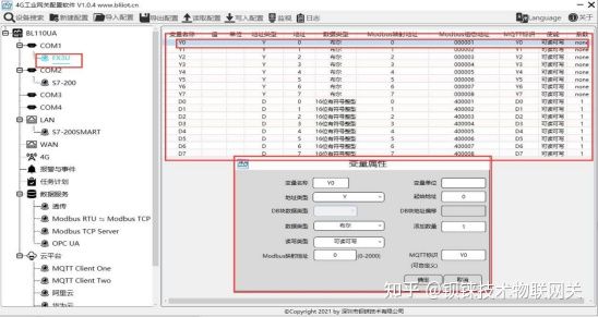 4个COM口的配置内容一样,COM1固定为RS232,COM2、COM3和COM4是RS232/RS485可选串口(默认为RS485)。因三菱FX3U是RS422接口,通过RS422转RS232线接到BL110网关上,故选择COM1口采集FX3U。