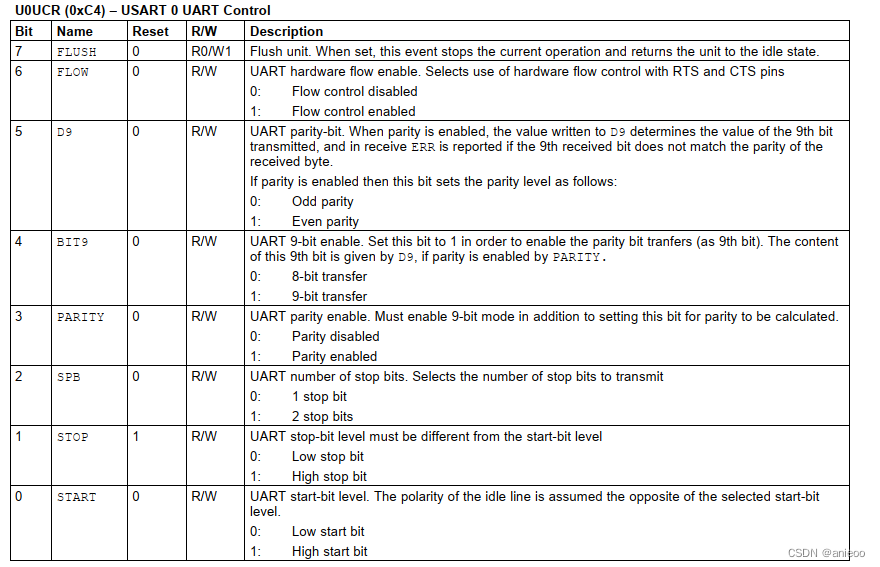 U0UCR = 0x00; //禁止流控制 8位数据传输 禁止奇偶校验 1位停止位