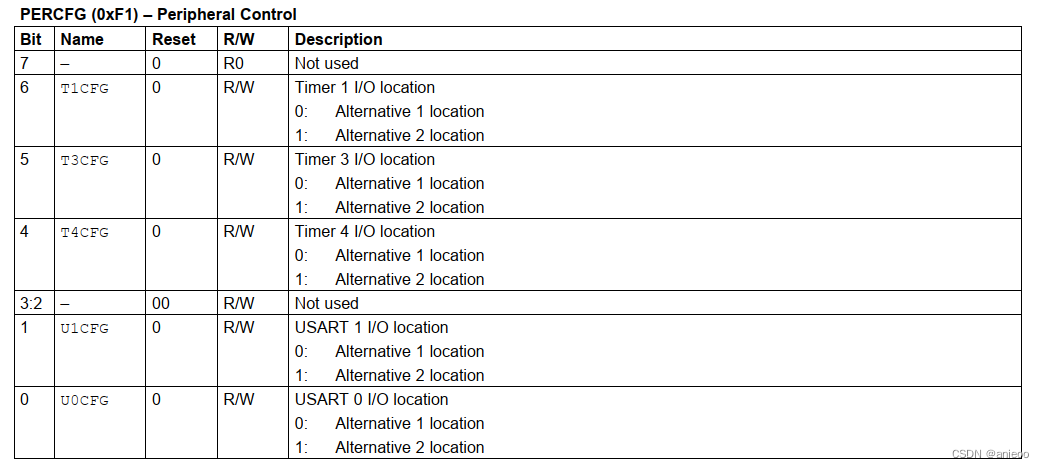 PERCFG = 0x00; //外设控制寄存器 USART 0的IO位置:0为P0口位置1