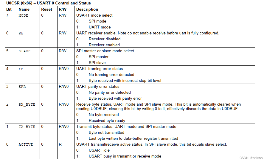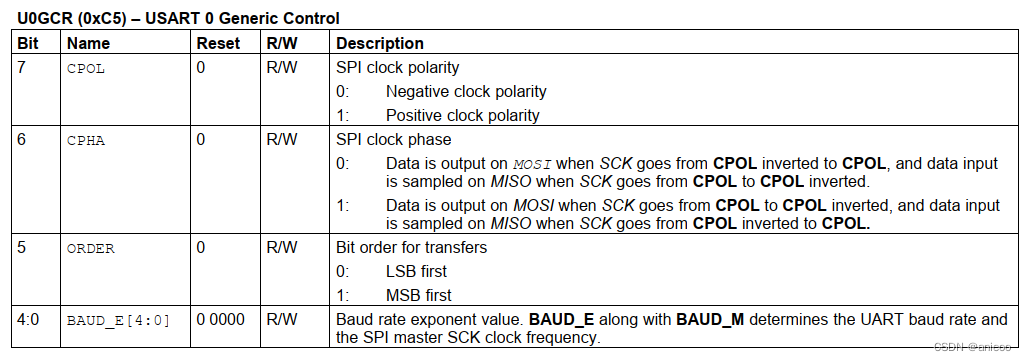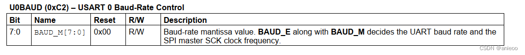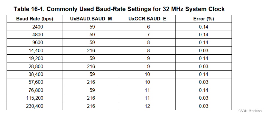 U0GCR寄存器的低5位和U0BAUD寄存器的8位共同决定通讯的波特率大小,下面给出常用波特率配置表: