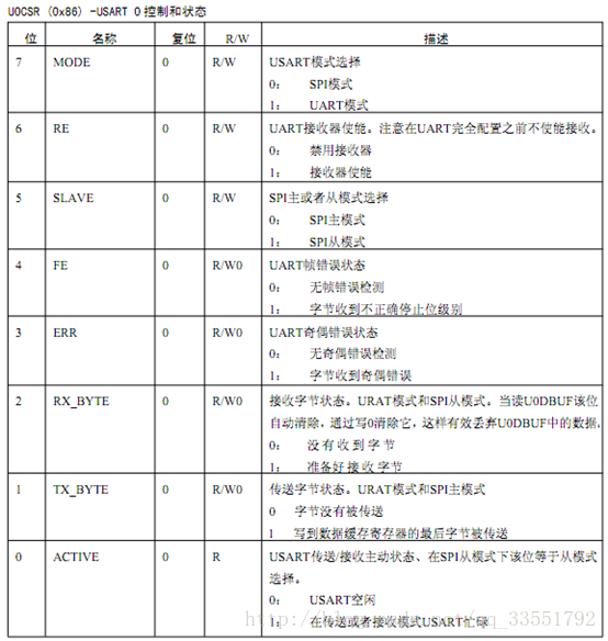 对于CC2530的每个USART串口通信,有5个如下的寄存器(x是USART的编号,为0或者1):