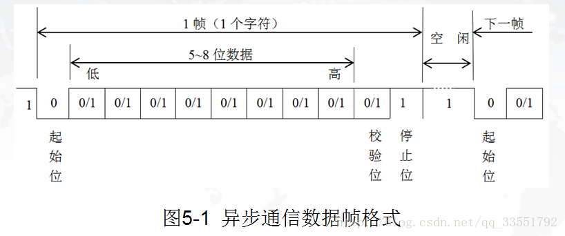 每一帧数据由起始位(低电平)、数据位、奇偶校验位(可选)、停止位(高电平)组成。帧的格式如图5-1所示: