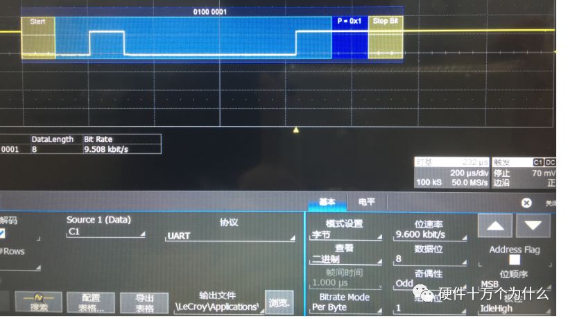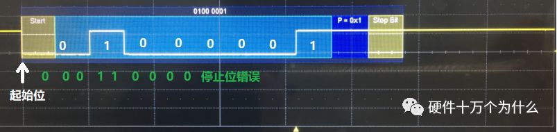 发送方发出9600波特率信号,但是接收方的波特率设置为19200。起始位没有问题,因为能够接收到那个下降沿,低电平。所以,会去解析数据,但是会出现误码。我们在信号上分析一下就知道了: