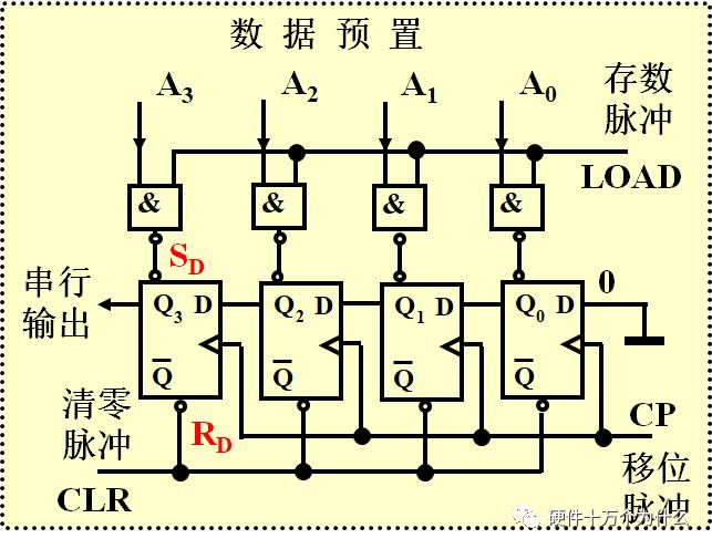 然后Q3的输出,是在每个时钟节拍,按照这个先后顺序,把A3A2A1A0串行的输出出去。