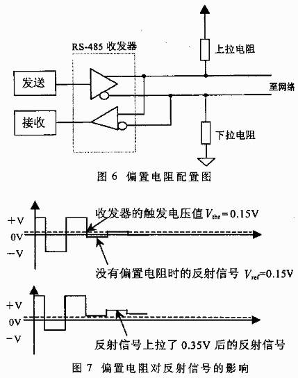 在通讯波特率比较高的时候,在线路上偏置电阻是很有必要的。偏置电阻的连接方法如图6。它的作用是在线路进入空闲状态后,把总线上没有数据时(空闲方式)的电平拉离0电平,如图7。这样一来,即使线路中出现了比较小的反射信号或干扰,挂接在总线上的数据接收器也不会由于这些信号的到来而产生误动作。