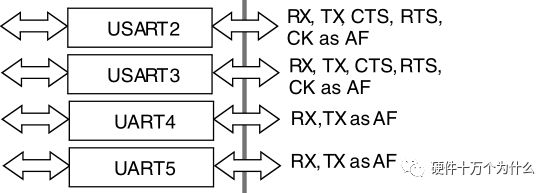 从iBox选择的STM32F103的MCU的结构框图上面,我们可以看到有一堆UART、USART。