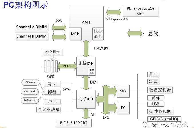 CPU下面是北桥负责高速外设、北桥的南面(下面)是南桥负责低速接口外设、然后还有一个SIO负责更低速的外设。