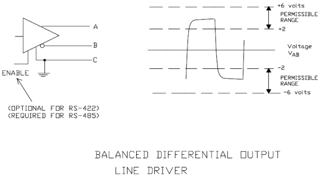 通常情况下,发送驱动器A、B之间的正电平在+2~+6V,是一个逻辑状态,负电平在-2~6V,是另一个逻辑状态。另有一个信号地C,在RS-485中还有一“使能”端,而在RS-422中这是可用可不用的。