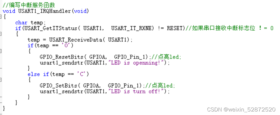 //重定向printf:输出函数 int fputc(int ch,FILE *f) { USART_SendData( USART1, (uint8_t)ch );//将ch转化为无符号整型 while( USART_GetFlagStatus( USART1, USART_FLAG_TXE) == RESET);//判断串口当前的状态 return (ch); } //重定向printf:输入函数 int fgutc(FILE *f) { ; while( USART_GetFlagStatus( USART1, USART_FLAG_RXNE) == RESET);//判断串口当前的状态 return (int)USART_ReceiveData( USART1); } -
