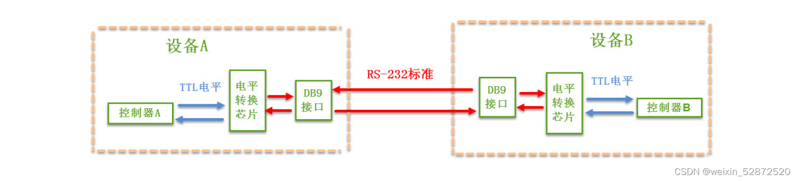 两个设备的“DB9接口”之间通过串口信号线建立起来连接,串口信号线中使用“RS-232标准”传输数据信号。由于RS-232电平标准的信号不能直接被控制器直接识别,所以这些信号会经过一个“电平转换芯片”转换成控制器能识别的“TTL标准”的电平信号,才能实现通讯。
