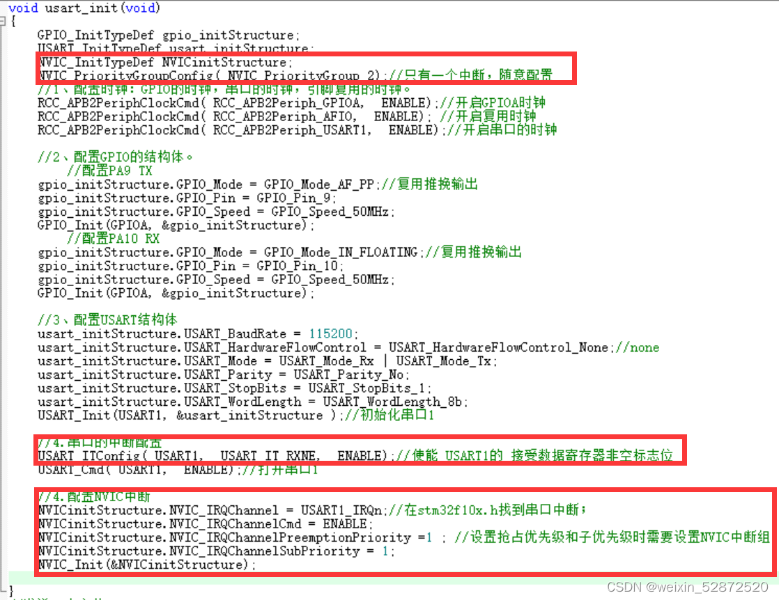 - 注意配置NVIC结构体前,先要配置NVIC中断优先级组。