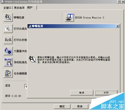 4、依次点击【喷嘴检查】,【打印】,会先打印一张对比图,【开始】,然后正在清洗,能看到条形进度,清洗结束后点击【打印喷嘴检查图案】。