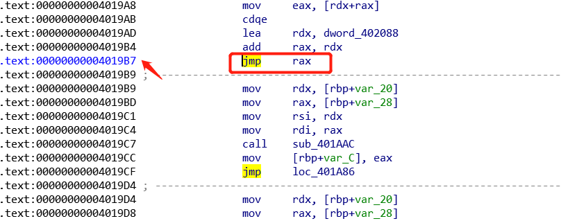 将断点断在跳转时,因为rax是通过动态赋值的,因此ida不能分析出具体跳转的函数