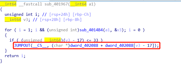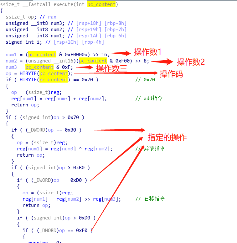 在执行指令的函数里,具体的指令操作没有反编译出来,我们需要动态调试将指令具体的操作的函数偏移调试出来。