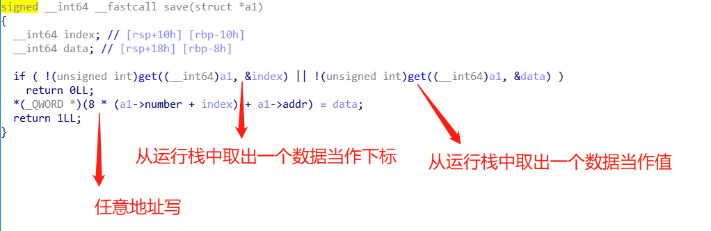 save函数就是从运行栈的栈顶中取出两个值,一个值作为下标,另一个作为值进行赋值,很显然是一个任意地址写的功能,因为下标的值没有进行限制,因此存在一个数组越界。