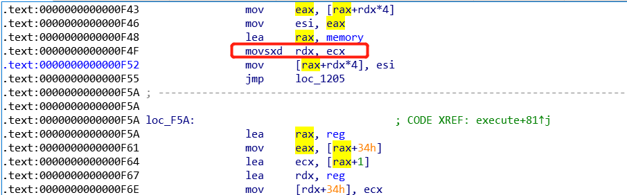 采用movsxd指令进行下标的转移,movsxd是进行符号填充再进行转移,即数组的下标是有符号数。