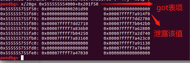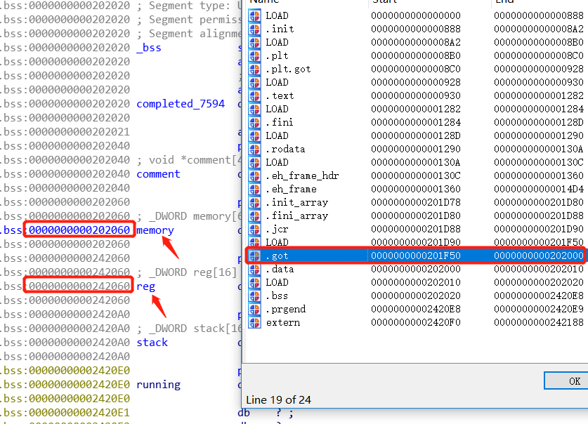 可以看到用于保存指令的memory以及用于寄存器存储的reg的地址都比got表的地址大,那么大数组的下标为负数时,即可越界读取got表内的地址,完成基地址的泄露