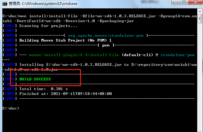 mvn install:install-file -Dfile=wo-sdk-1.0.3.RELEASE.jar -DgroupId=com.uniubi -DartifactId=wo-sdk -Dversion=1.0 -Dpackaging=jar提示build success,(此处我已经安装过了)