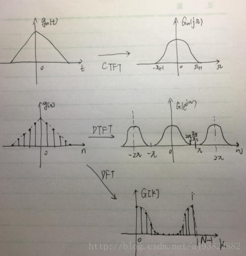 数字化处理分两步,第一步是时域离散化,即时域采样(CTFT->DTFT),第二步是频域离散化,即频域采样(DTFT->DFT)。