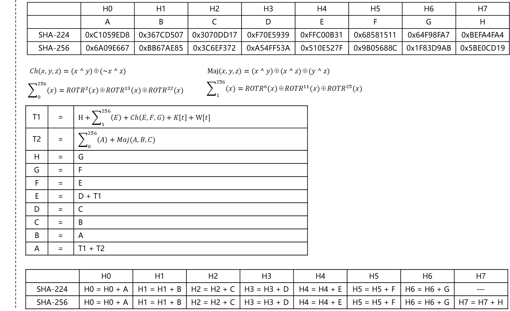 T1 = H + (E >>> 6) ⊕ (E >>> 11) ⊕ (E >>>25) + (E & F) ⊕ (~E & G) + K[t] + W[t]