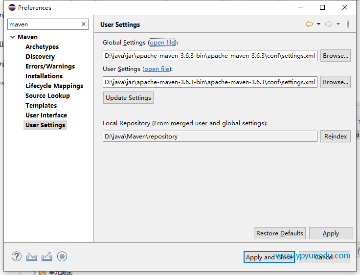 如果还需要其他的镜像,可以类似的添加入mirrors标签中。 5.将settings.xml复制到本地仓库目录下(例如我的是:D:javaMavenrepository) 6.为eclipse配置maven 打开eclipse点击Window->Preferences->搜索框中输入Maven->选择User Settings