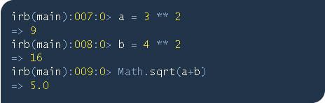Math是Ruby内建的数学模块。在Ruby中,模块提供了两种角色:一种角色是将类似的方法聚集在同一个“家族”名下。因此,Math也包括sin、tan这样的方法。第二种角色是一个圆点(dot),它标记了消息的接收者。什么是消息?在上面的例子中,sqrt(9)便是消息,它意味着调用sqrt方法取出9的平方根。