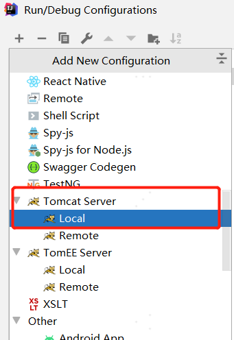 2.点击左上方【+】,选择【Tomcat Server】->【Local】,注意:不是下面的【TomEE Server】下的。如下图所示: