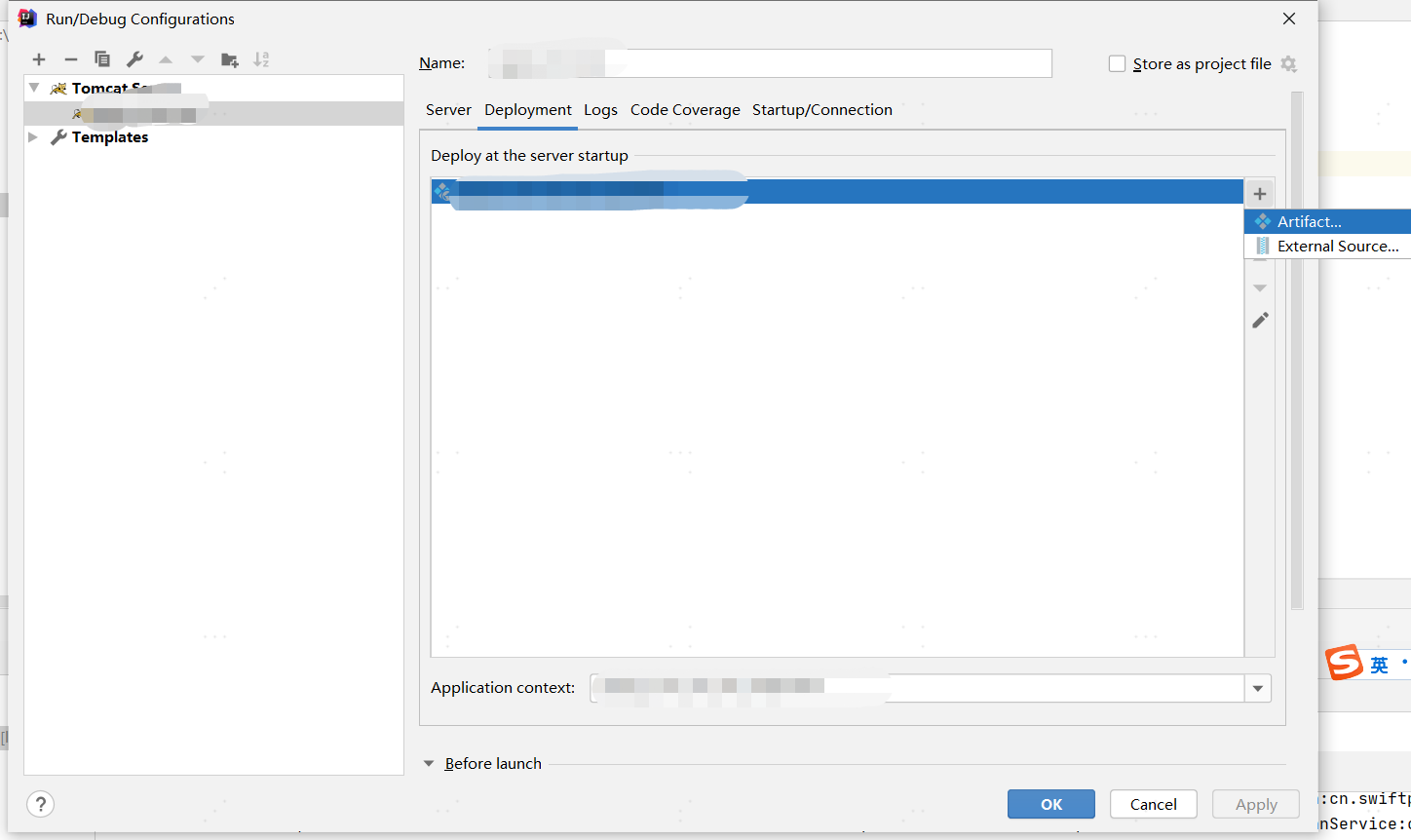 4.配置Deployment,点击右侧【+】->【Artifacct】,选择对应的应用进行发布,如下图: