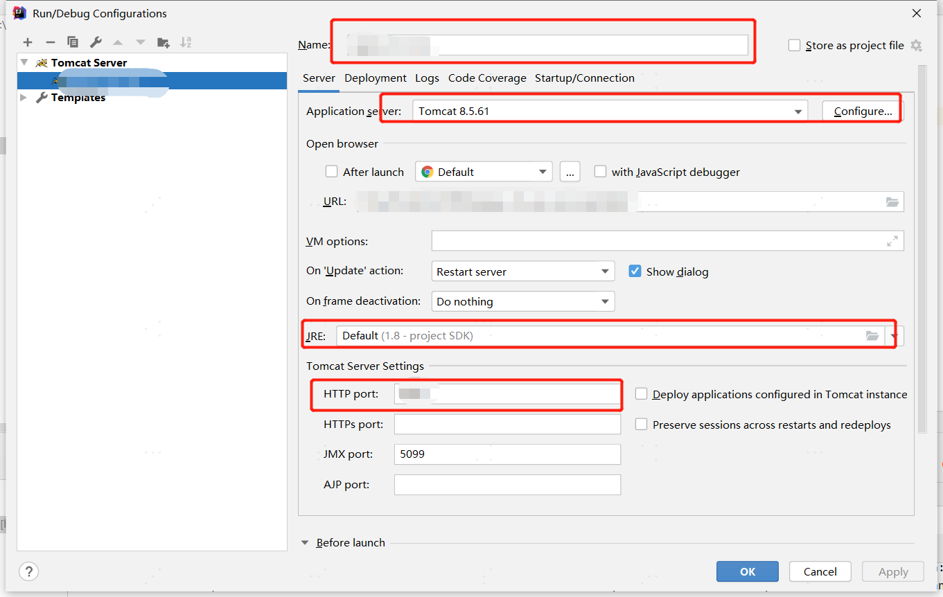 3.先配置server,输入name、点击【Configure...】选择自己的Tomcat解压目录,配置合适的JRE,并输入HTTP port,默认是8080。如下图: