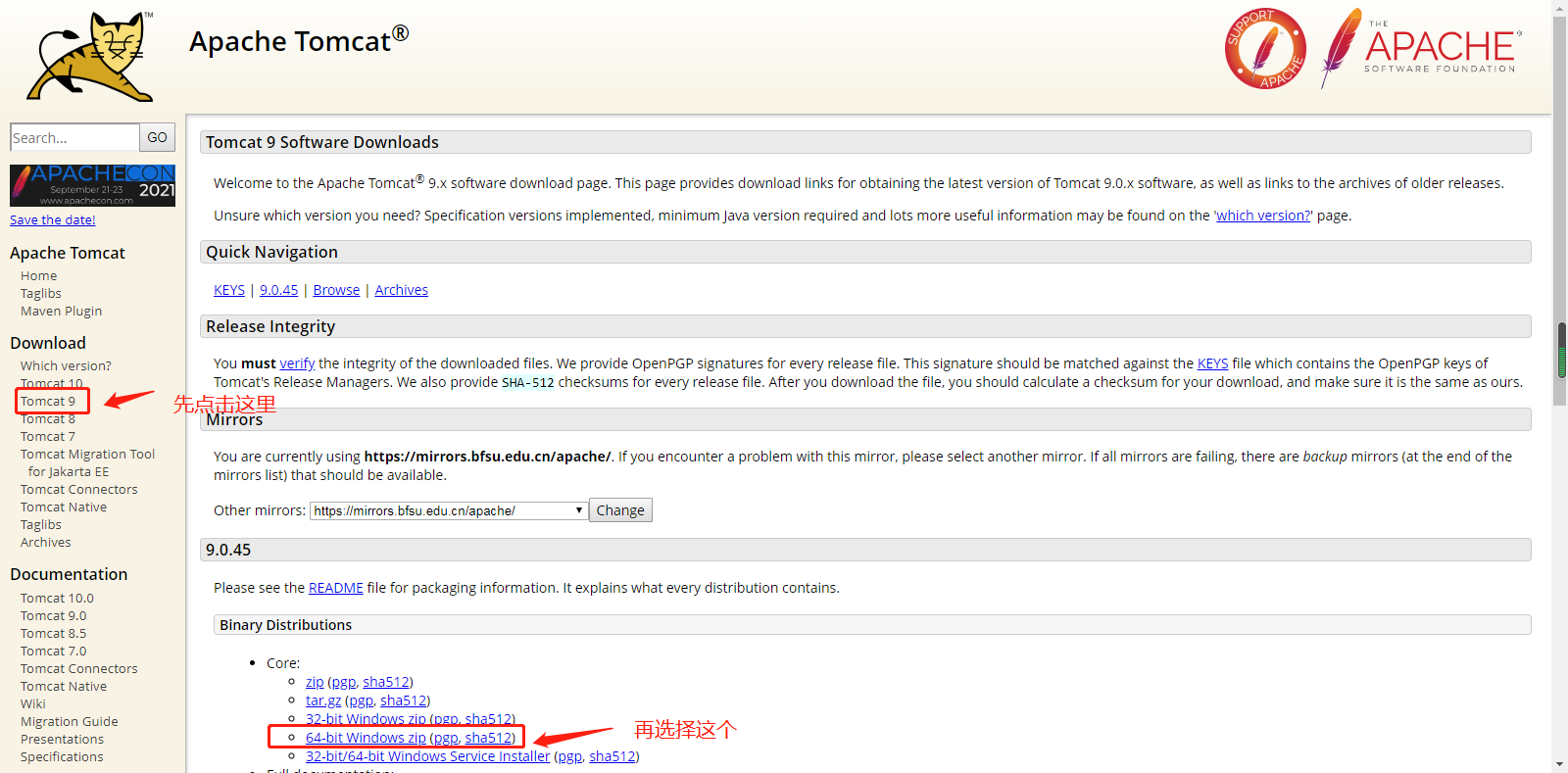 点击左侧菜单栏Tomcat9->64bit windows.zip