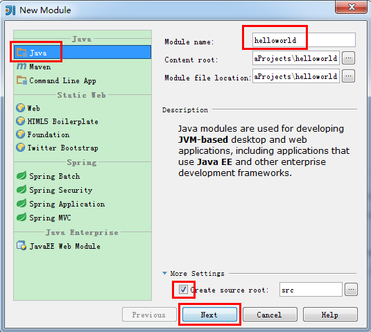 2.选择Java类型,在 Module name 处输入项目名,点击Next