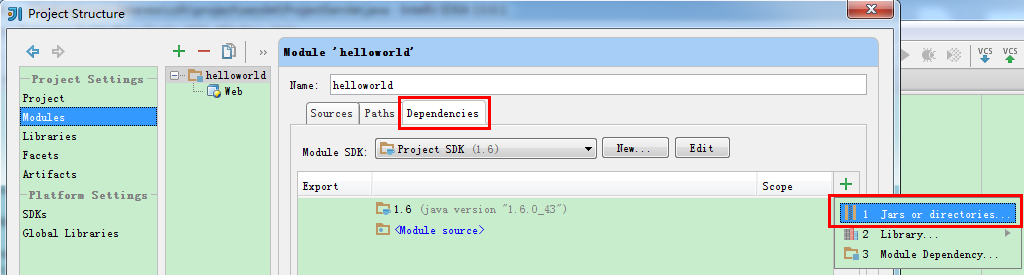 7.点击Modules -> Dependencies,点击 "+" -> "Jars or directories"