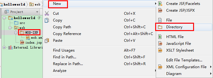 4.在项目的WEB-INF目录下点击右键,New -> Directory,创建classes和lib两个目录